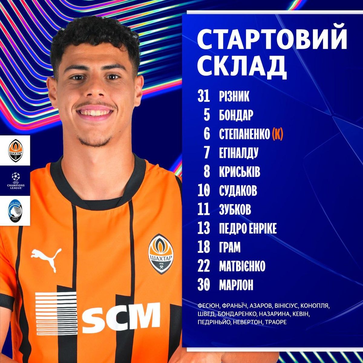 Запасні: Фесюн, Траоре, Франьїч, Швед, Азаров, Вінісіус Тобіас, Бондаренко, Конопля, Назарина, Кевін, Педрінью, Невертон
