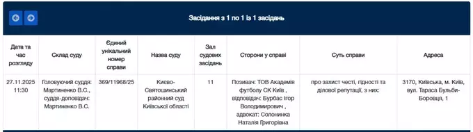 Розгляд справи призначено на 27 листопада у Києво-Святошинському районному суді Київської області. Раніше до Ігоря Бурбаса позивався півзахисник житомирського Полісся Олександр Андрієвський.